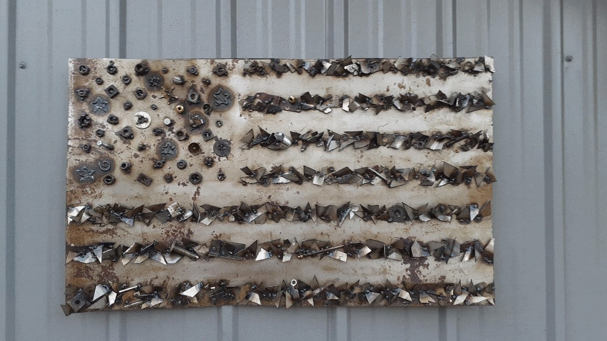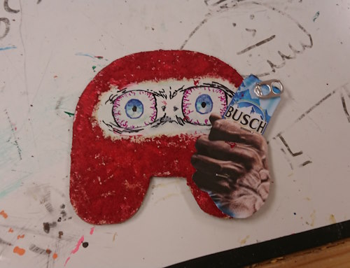 My submission for bad art night, red coat is painted glued sawdust, and the can is stapled into the board
