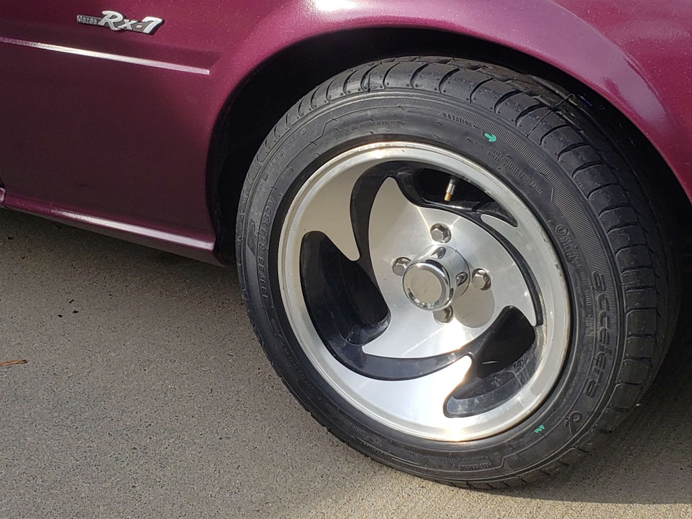 Rims: I was looking for rims for quite a long time to replace the curb-rashed 13" american racing rims it came with. Preferably tri-spokes. But fancy authentic japanese tuner tri-spokes are expensive. But what ISN'T expensive is overproduced goofy ass 90s blade rims. and they're 4 lug !!!