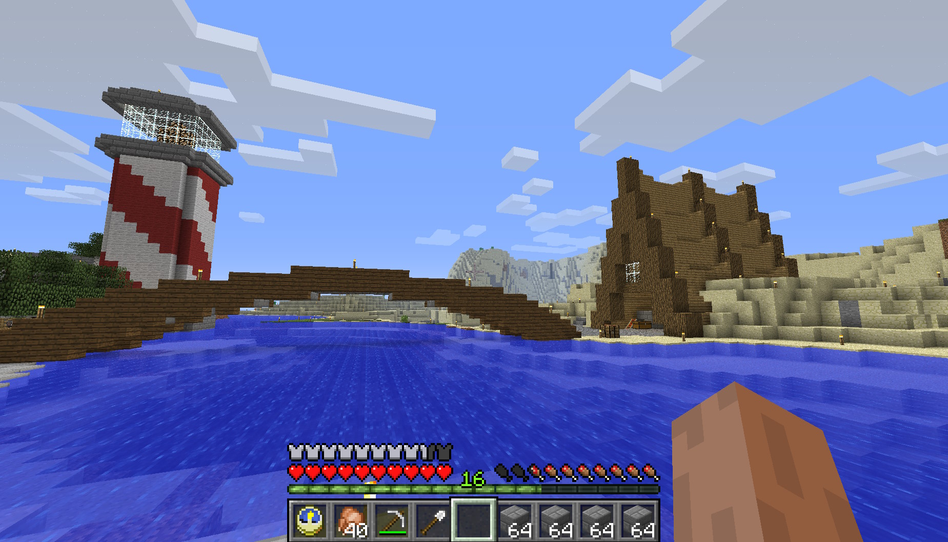 Around 2023 I got bored again, and decided to mess around in the world a bit more, starting mainly with this boat dock I made when my internet went out for two days. Boats suck in this version but it's a decent exploration method and I had this design in my head for a while