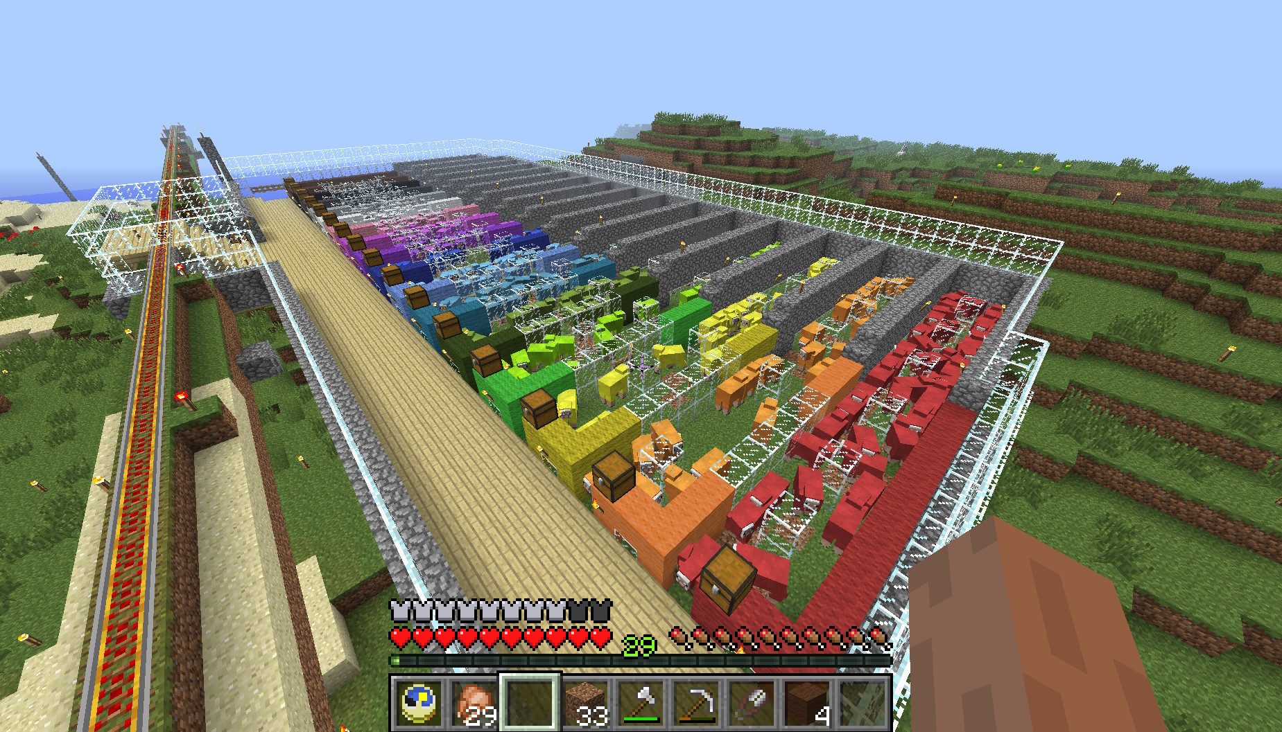 Currently has rails to my chicken exp farm, sheep farm, swamp outpost, desert outpost, and end portal.